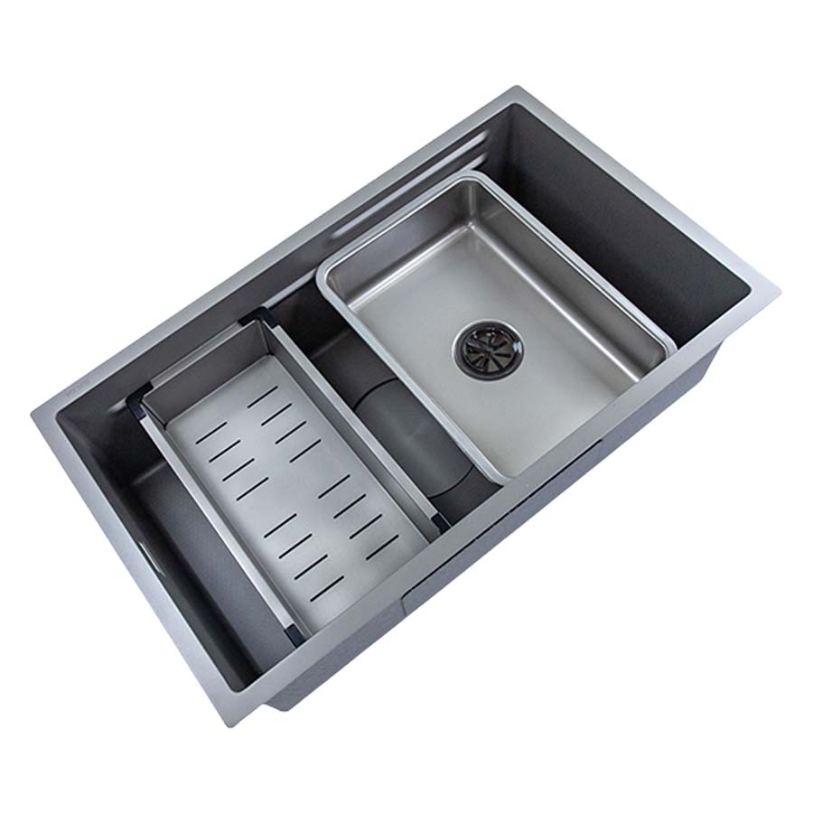 - Thiết kế gờ hạ bậc thông minh: Tích hợp rổ phụ + chậu nhỏ và siphon, mang đến không gian làm việc tiện lợi và ngăn nắp.